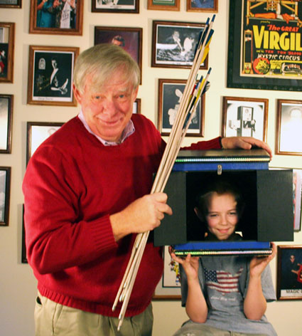 Your child becomes the star of his or her own television show as a box representing a TV is placed around his/her head. Arrows, representing television antennae, are thrust into the box. Instead of the arrows inflicting pain the box is opened to show that your child's head has completely disappeared! The children use the 'magic words' to restore your child's head. This illusion is recommended for children who are at least eight years of age.